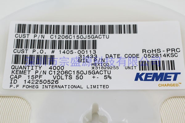 KEMET陶瓷電容 1206 50V 15PF C1206C150J5GACTU